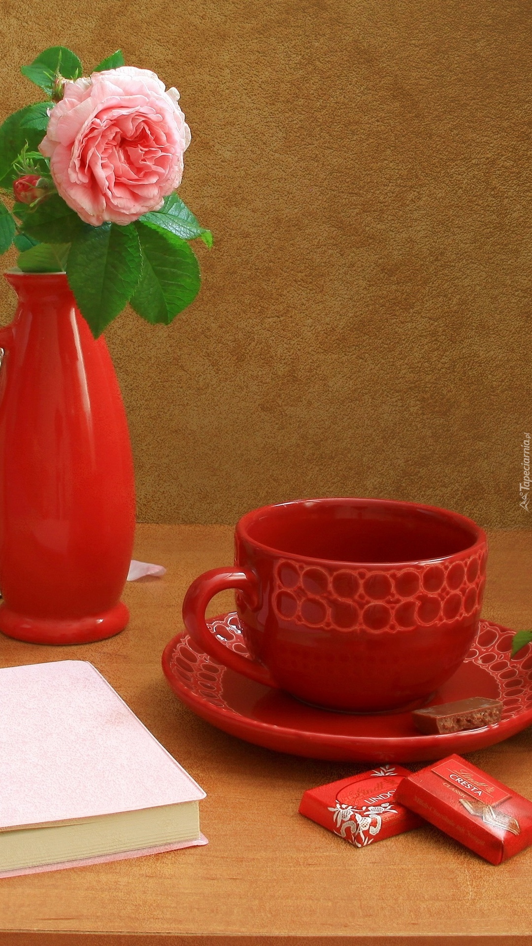Edytor tapety: Róża w czerwonym wazoniku obok filiżanki