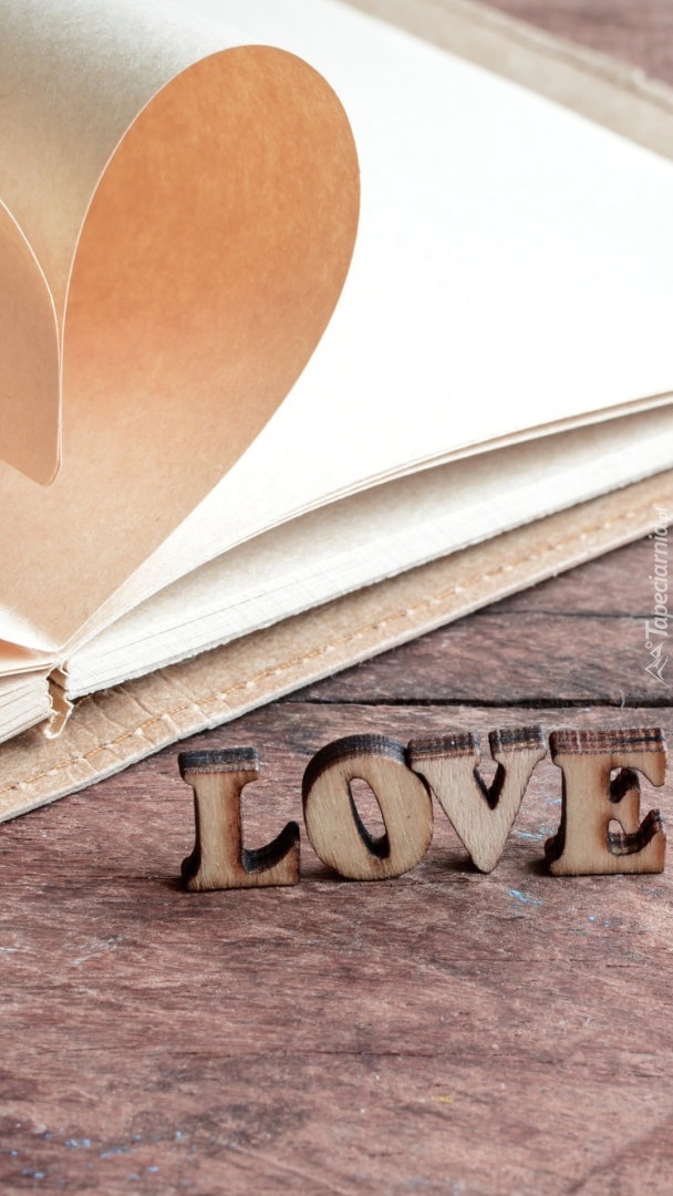 Edytor tapety: Drewniany napis Love obok zeszytu