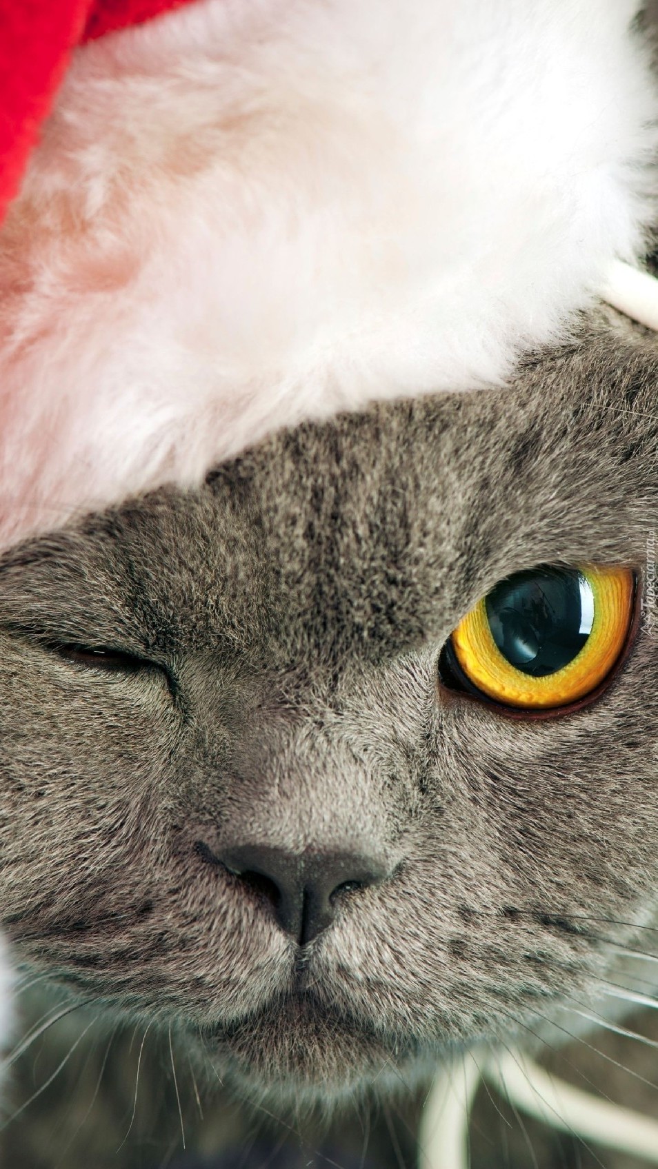 Edytor tapety: Przymróżone oko kota w czapce Mikołaja