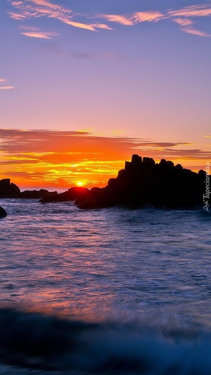 Edytor tapety: Słońce zachodzi za morskie skały