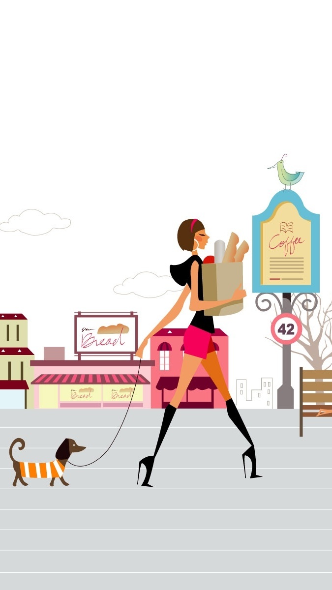 Edytor tapety: Kobieta z jamnikiem wraca z zakupów