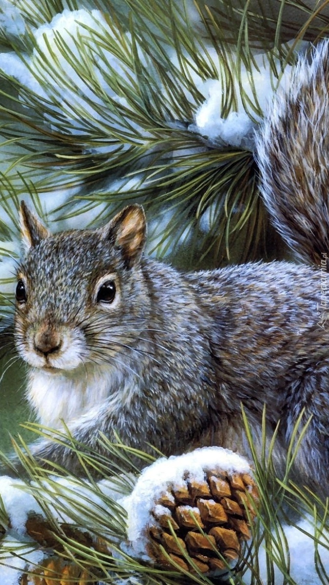 Edytor tapety: Wiewiórka na ośnieżonej sośnie