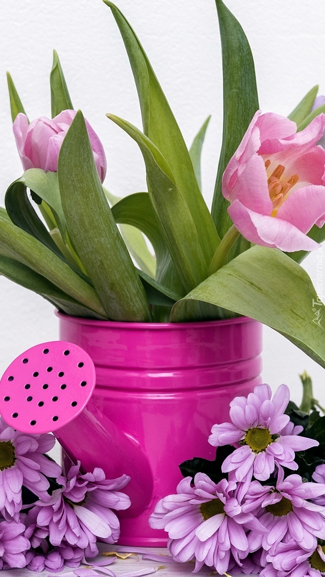 Edytor tapety: Chryzantemy obok konewki z tulipanami