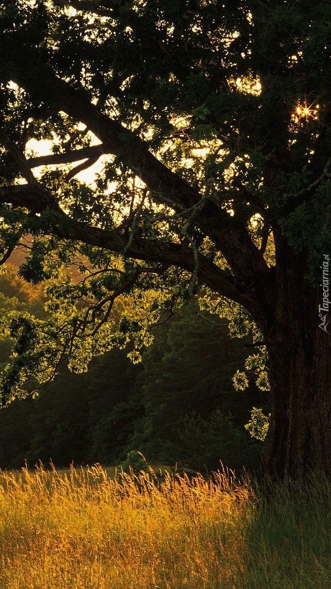Edytor tapety: Drzewo pochylone nad pożółkłą trawą