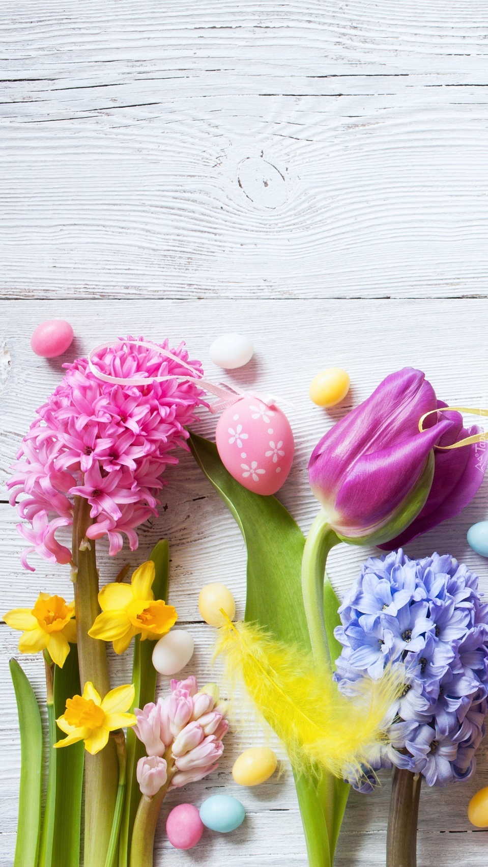 Edytor tapety: Wiosenne kwiaty i pisanki na deskach