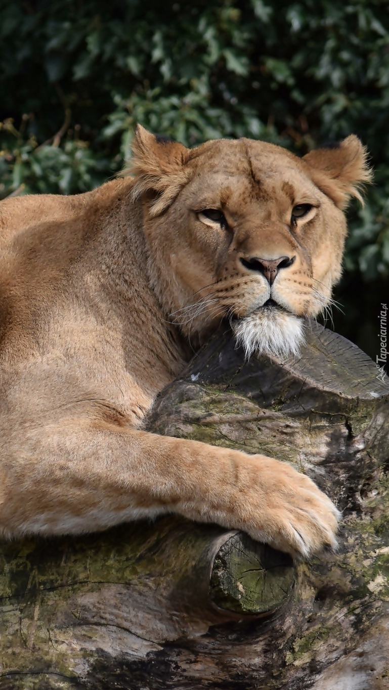 Edytor tapety: Lwica leżąca na kłodzie
