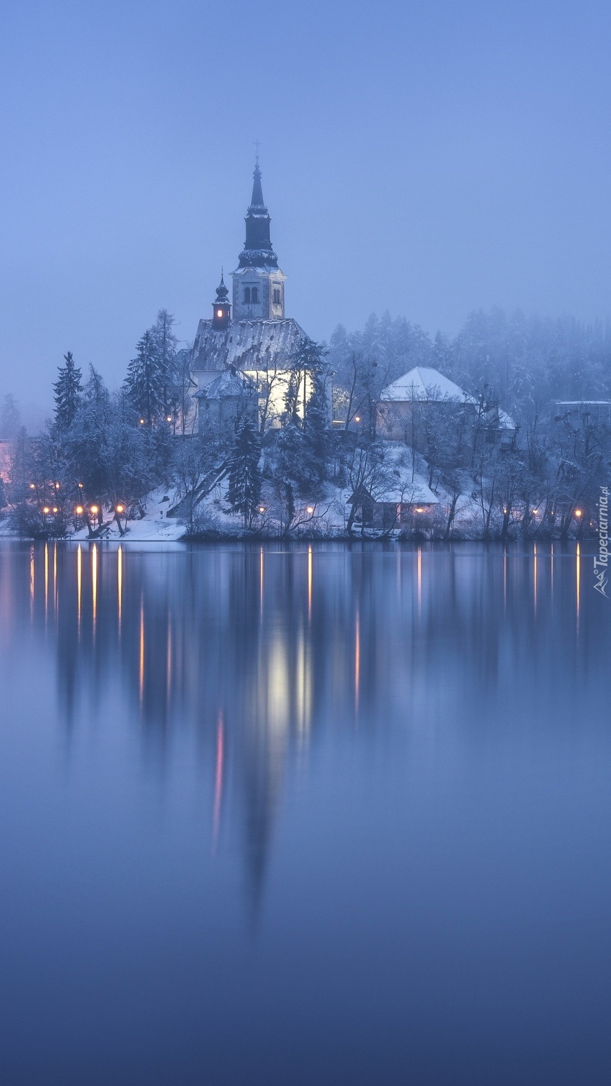 Edytor tapety: Kościół nad jeziorem Bled we mgle