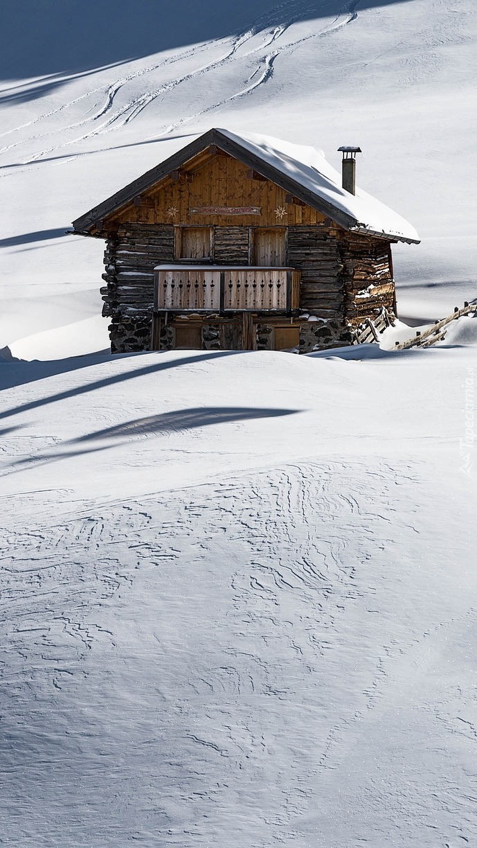 Edytor tapety: Drewniany domek na zaśnieżonym wzgórzu