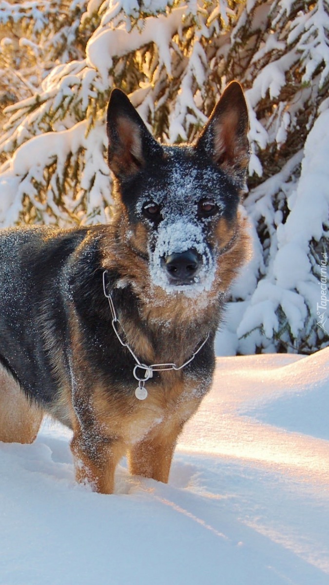 Edytor tapety: Owczarek niemiecki z mordką w śniegu