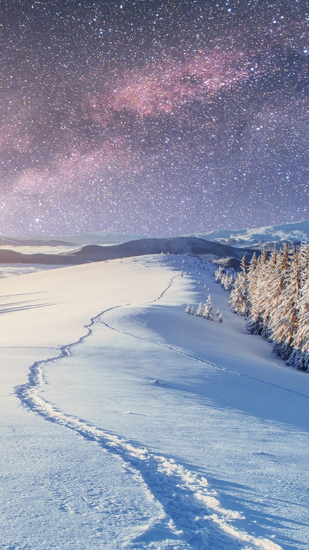 Edytor tapety: Rozgwieżdżone niebo nad ośnieżonymi wzgórzami