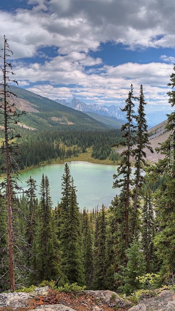 Edytor tapety: Drzewa wokół górskiego jeziora