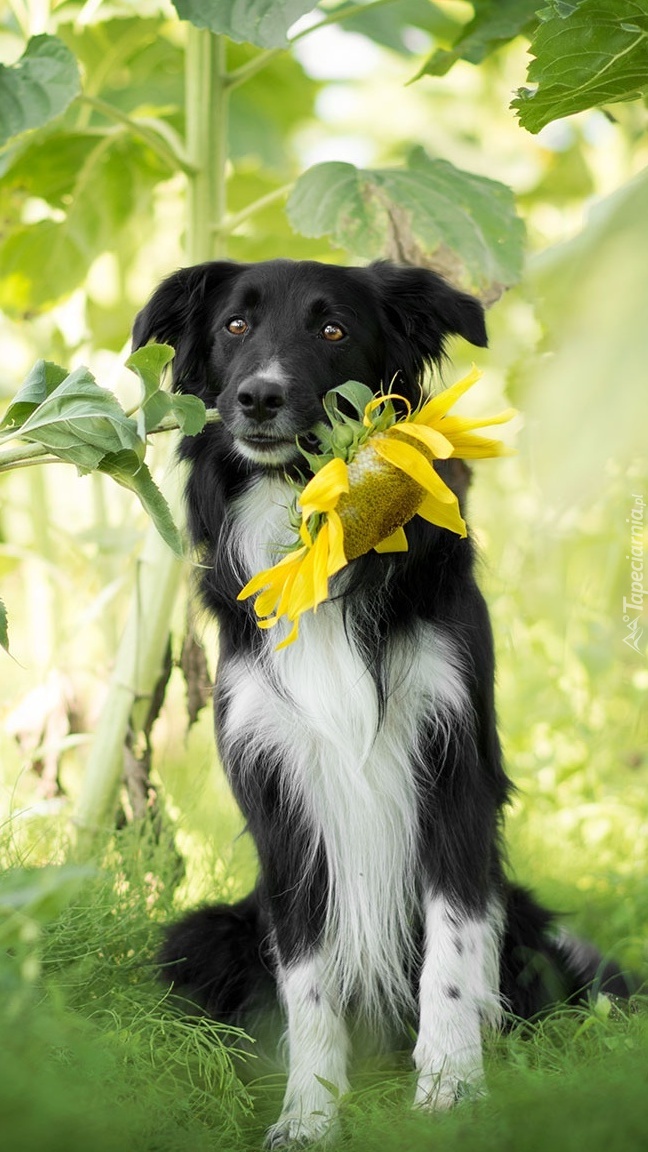 Edytor tapety: Border collie ze słonecznikiem w pysku
