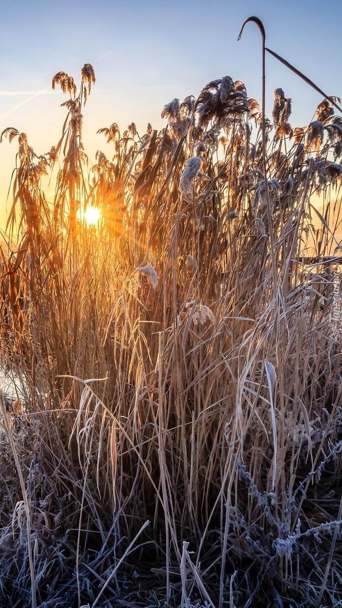 Edytor tapety: Oszroniona trawa o zachodzie słońca