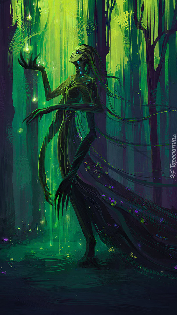 Edytor tapety: Fantastyczna postać wędrująca po lesie