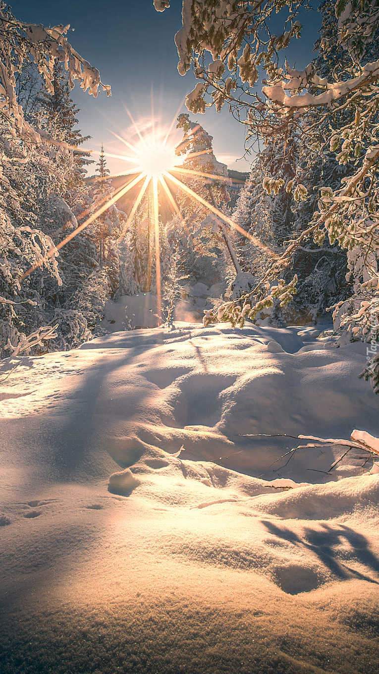 Edytor tapety: Promienie słońca w zimowym lesie