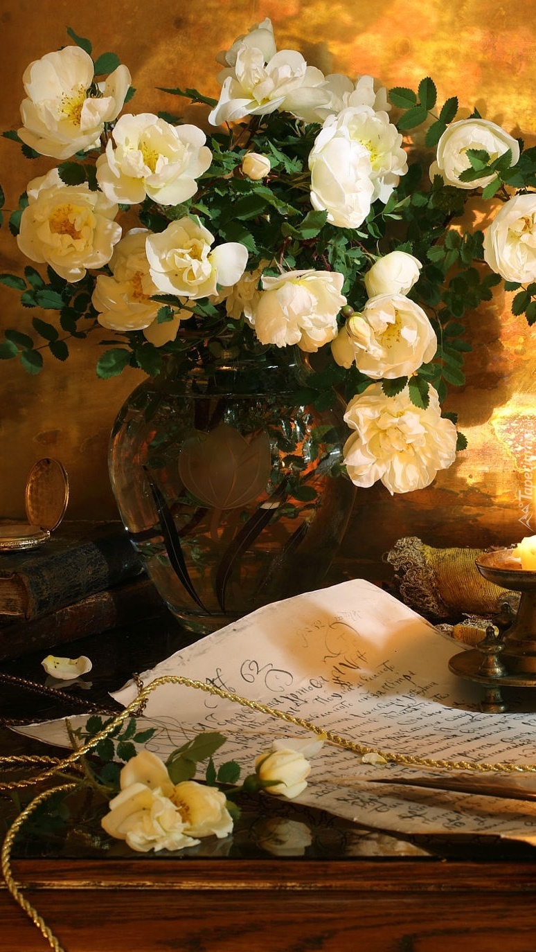 Edytor tapety: Bukiet białych róż w wazonie