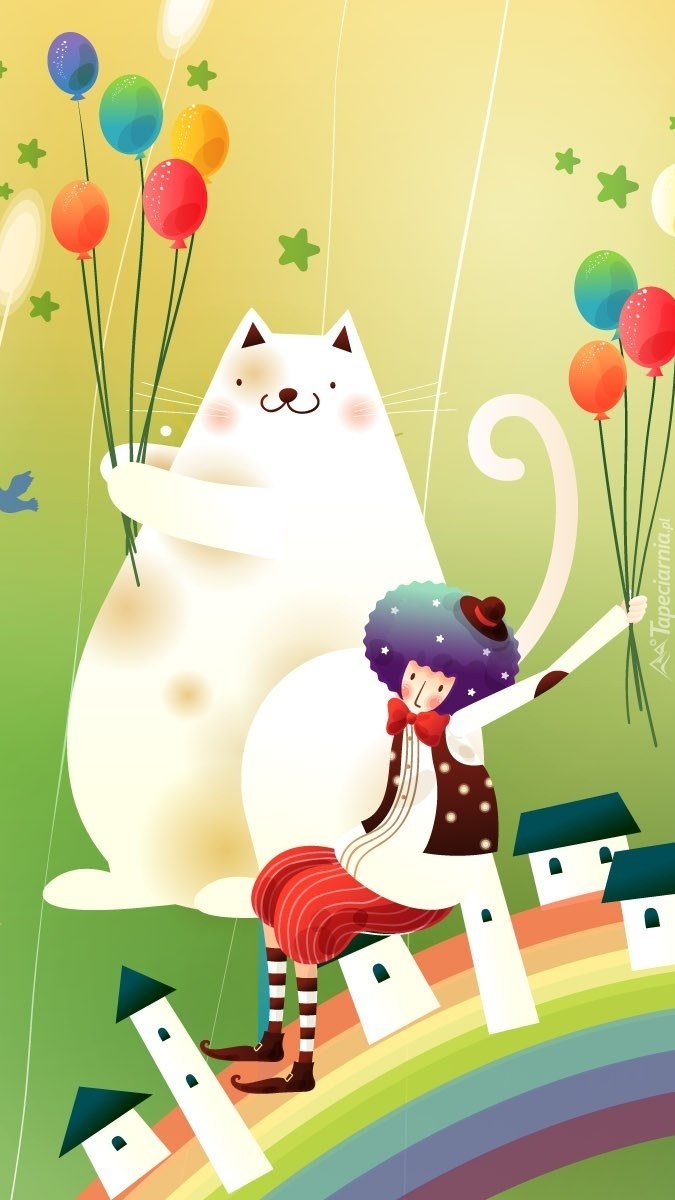 Edytor tapety: Tęczowe zabawy pajacyka i kota