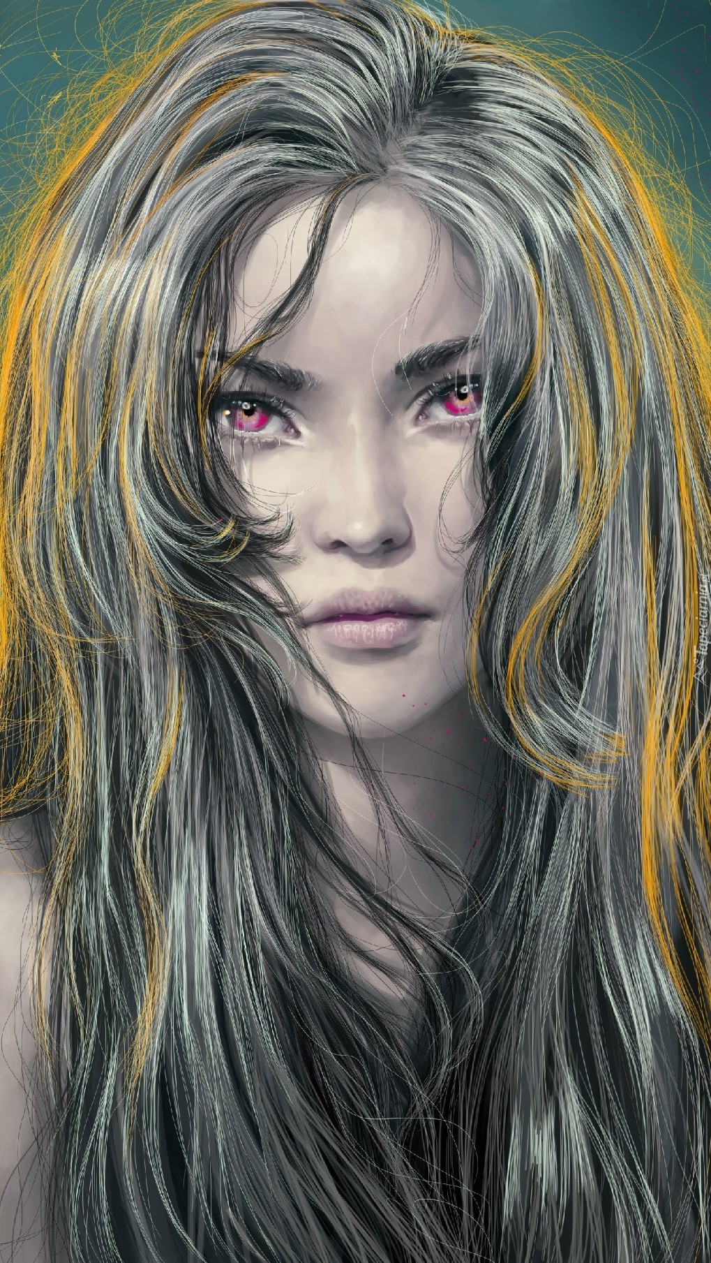 Edytor tapety: Długowłosa kobieta o czerwonych oczach
