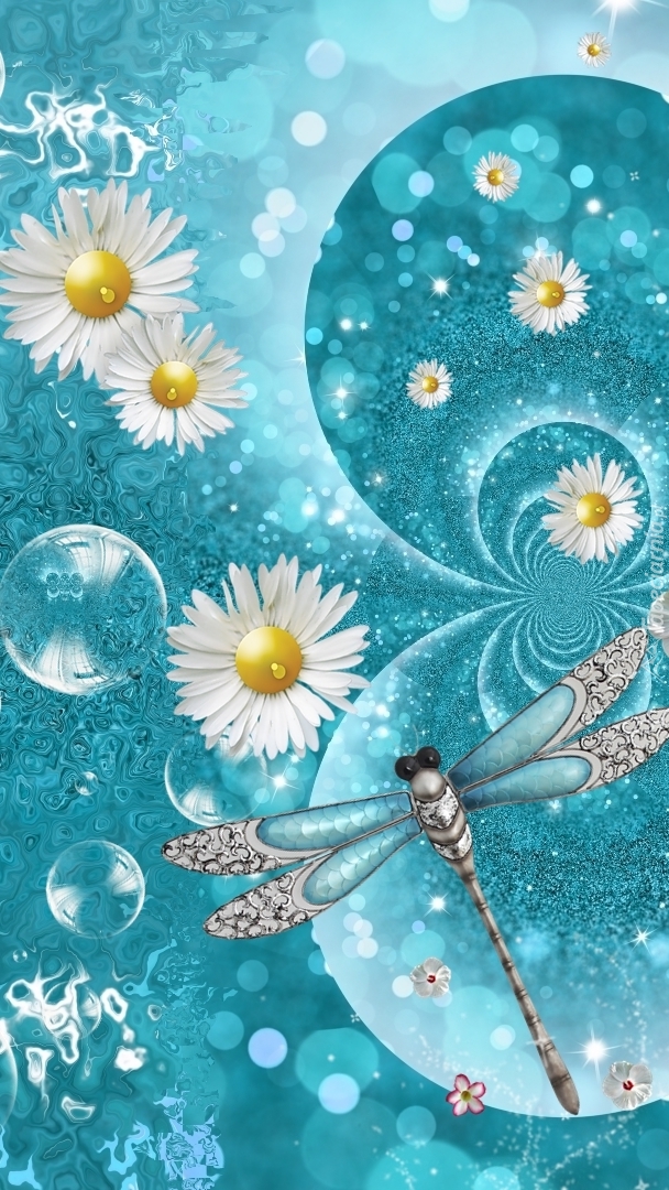 Edytor tapety: Ważka nad stokrotkami