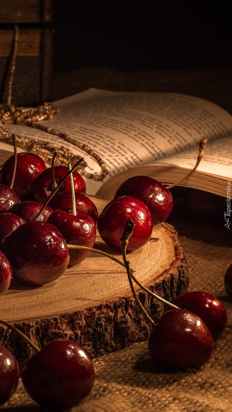 Edytor tapety: Wiśnie na drewnie obok książki
