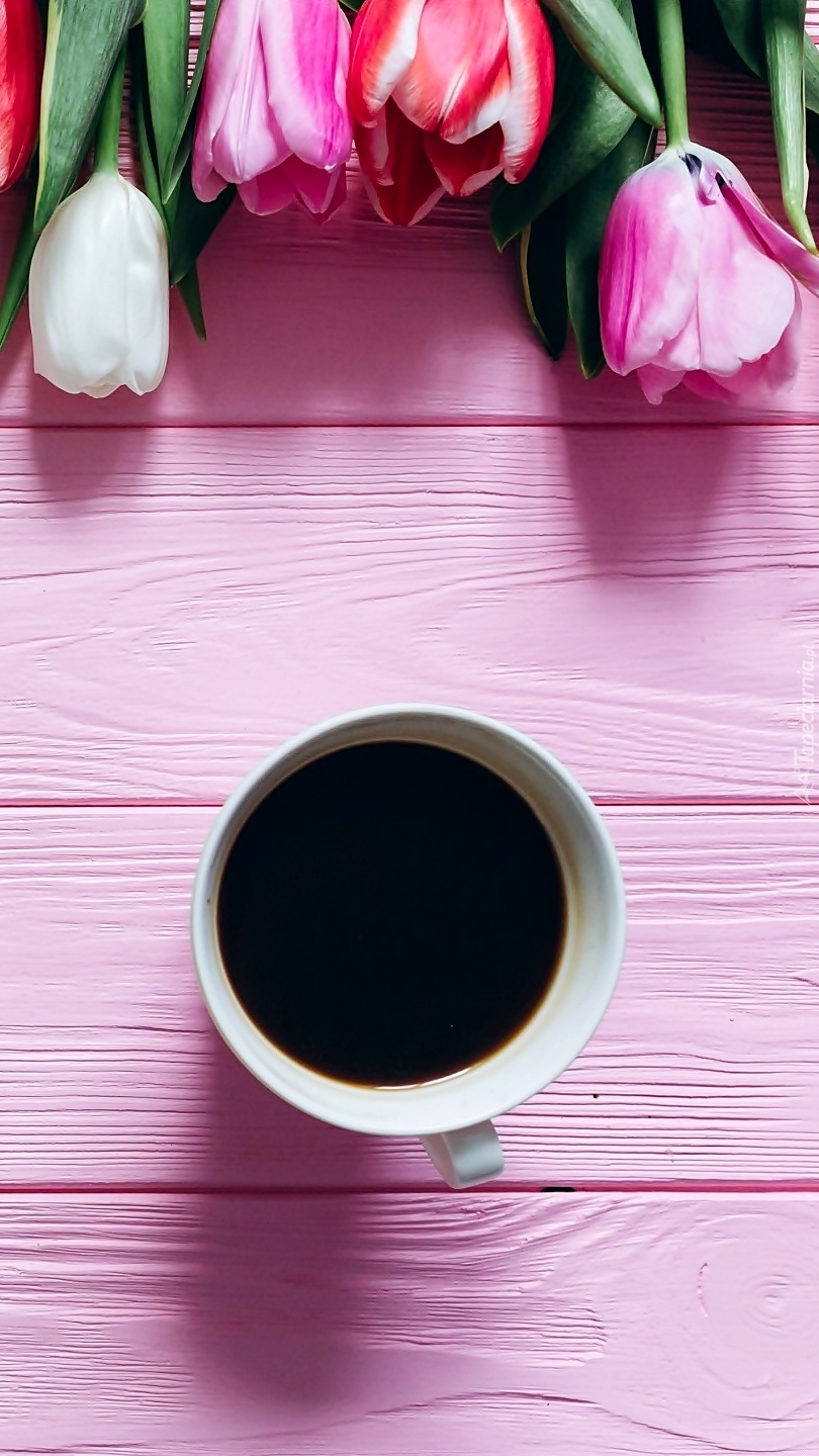 Edytor tapety: Tulipany na deskach i kawa