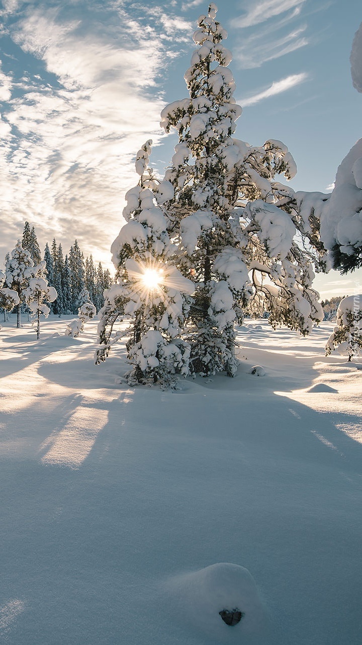 Edytor tapety: Ośnieżone drzewa w słońcu