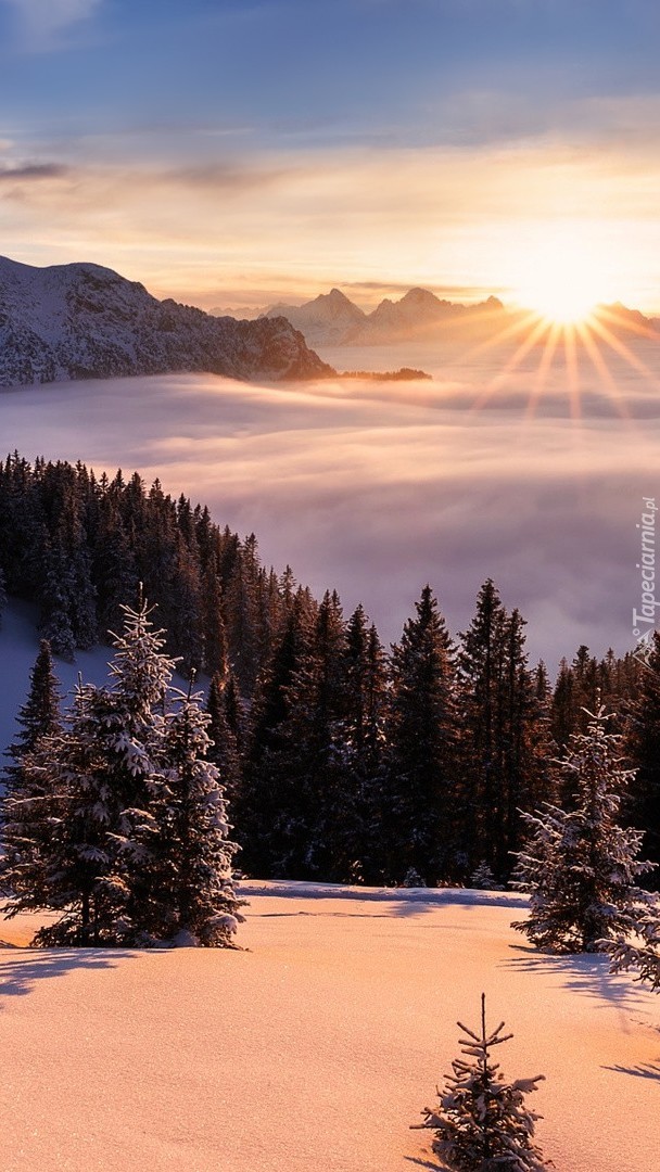 Edytor tapety: Promienie słońca nad ośnieżonymi górami