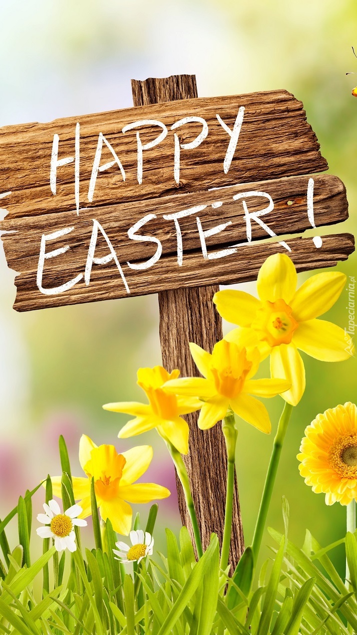 Edytor tapety: Napis Happy Easter z wiosennymi kwiatami