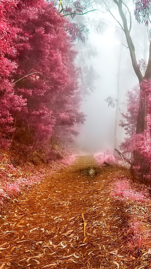 Edytor tapety: Ścieżka między drzewami o czerwonych liściach