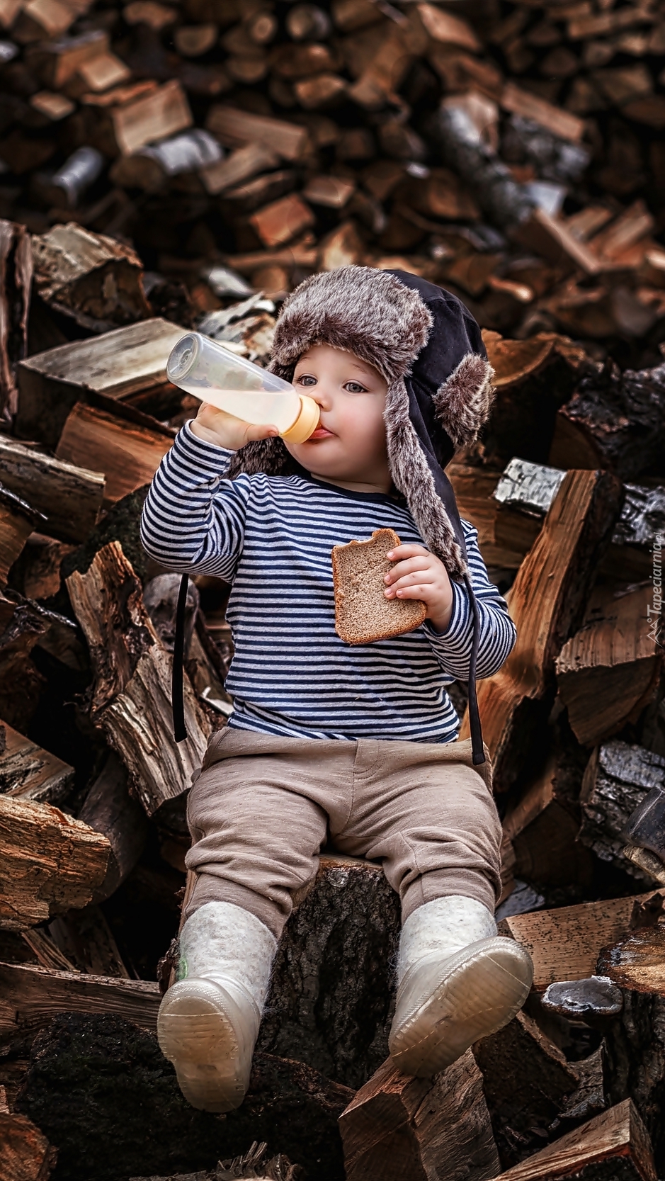 Edytor tapety: Dziecko z butelką mleka i chlebem