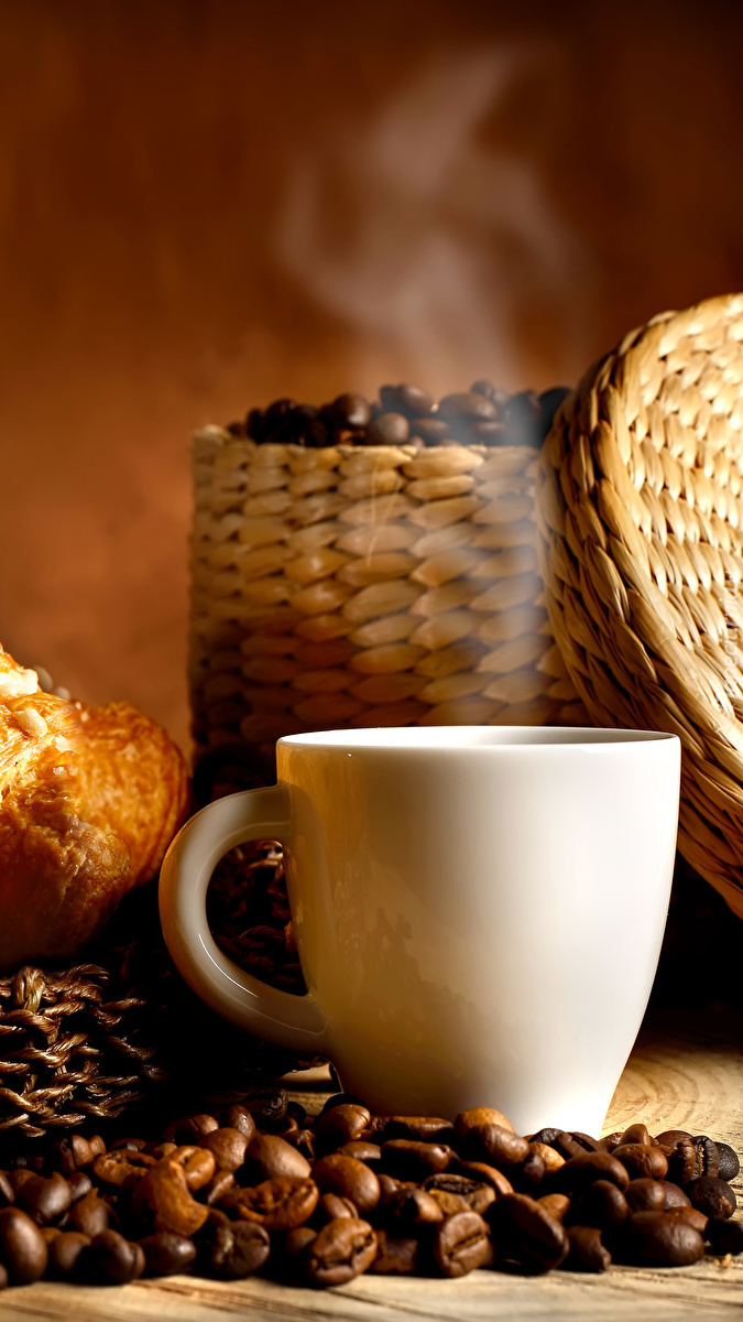 Edytor tapety: Kubek gorącej kawy na ziarnach