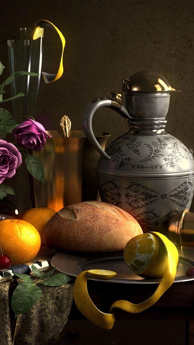 Edytor tapety: Dzban koło chleba i cytryny