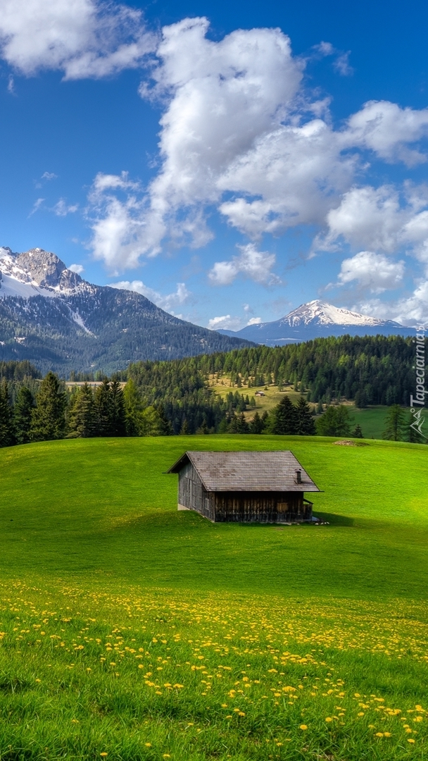 Edytor tapety: Drewniany domek na łące w górach