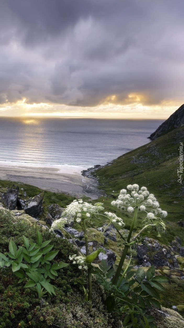Edytor tapety: Zachmurzone niebo nad plażą Kvalvika