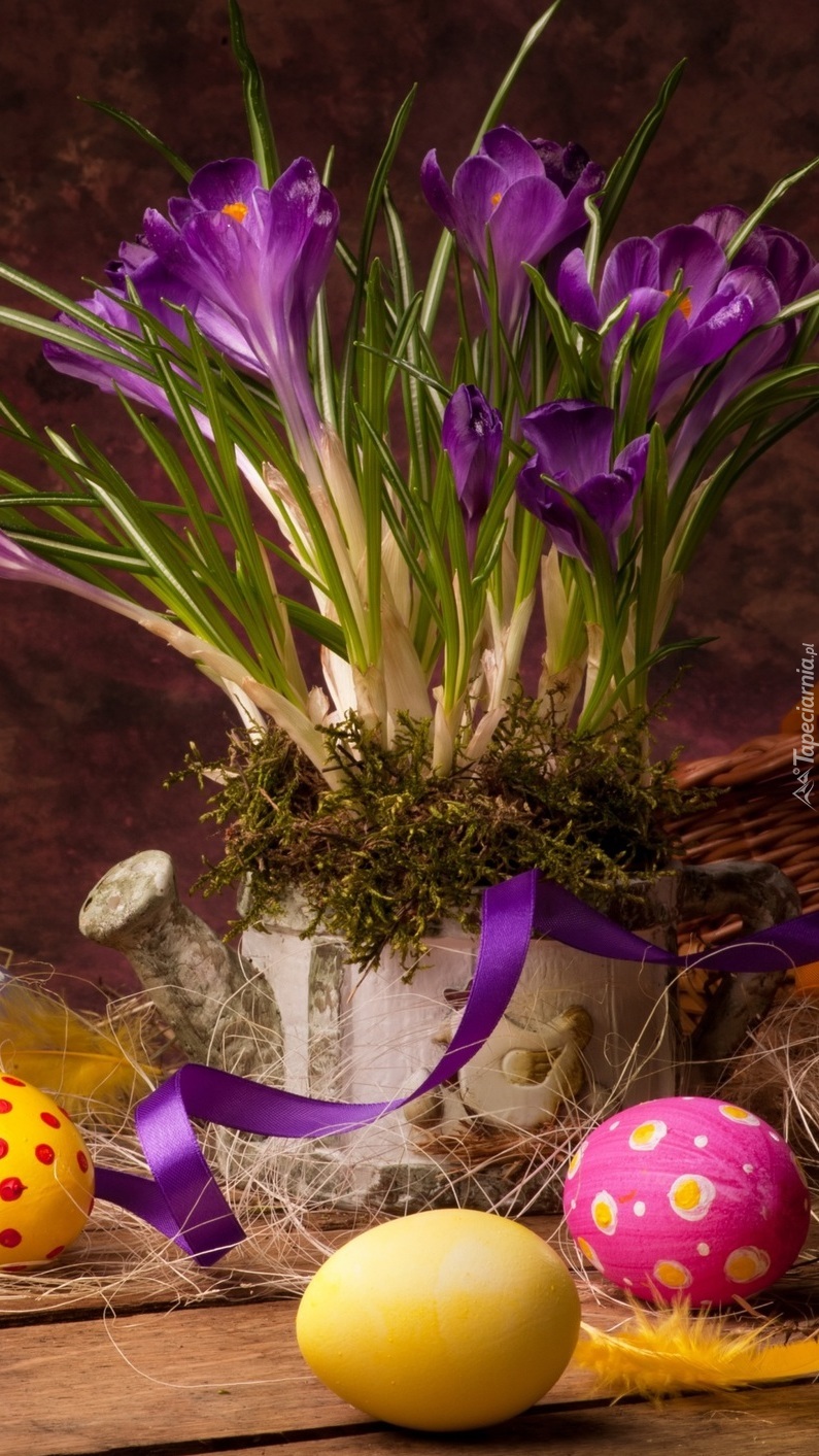 Edytor tapety: Krokusy w konewce z pisankami