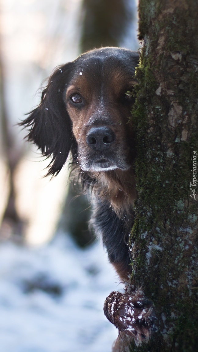 Edytor tapety: Pies zerkający zza drzewa