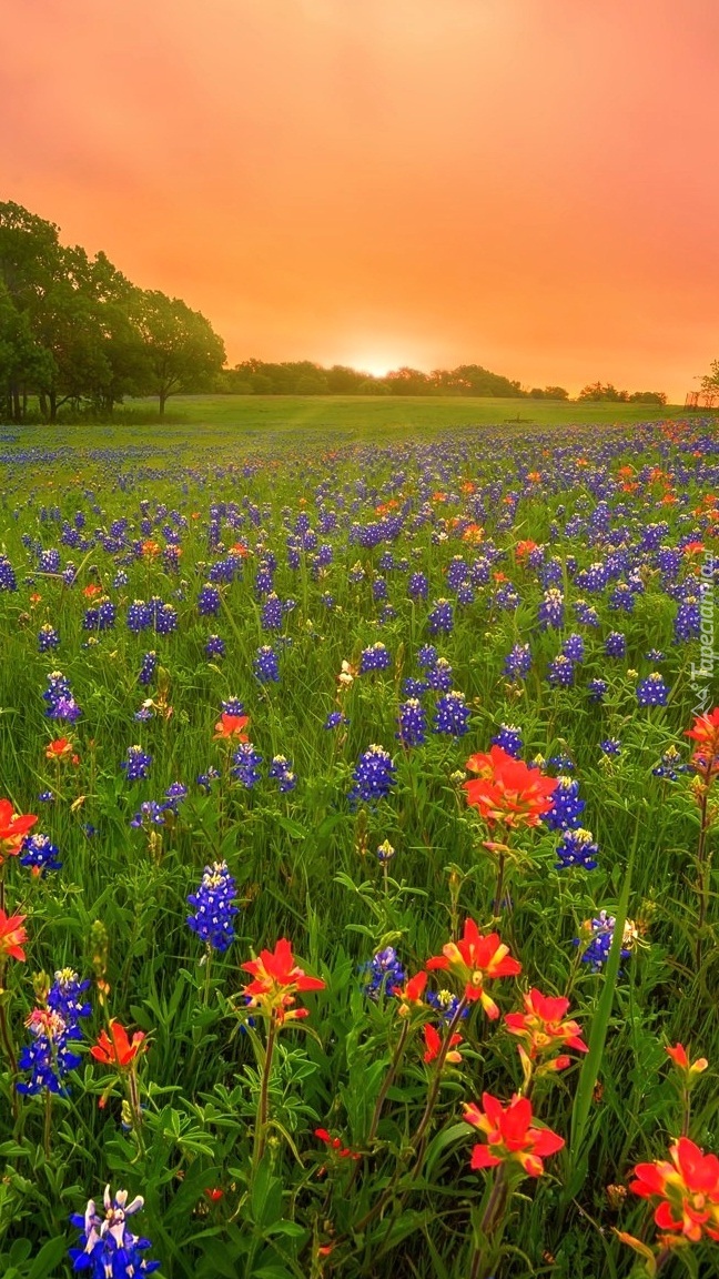 Edytor tapety: Zachód słońca nad kwiecistą łąką