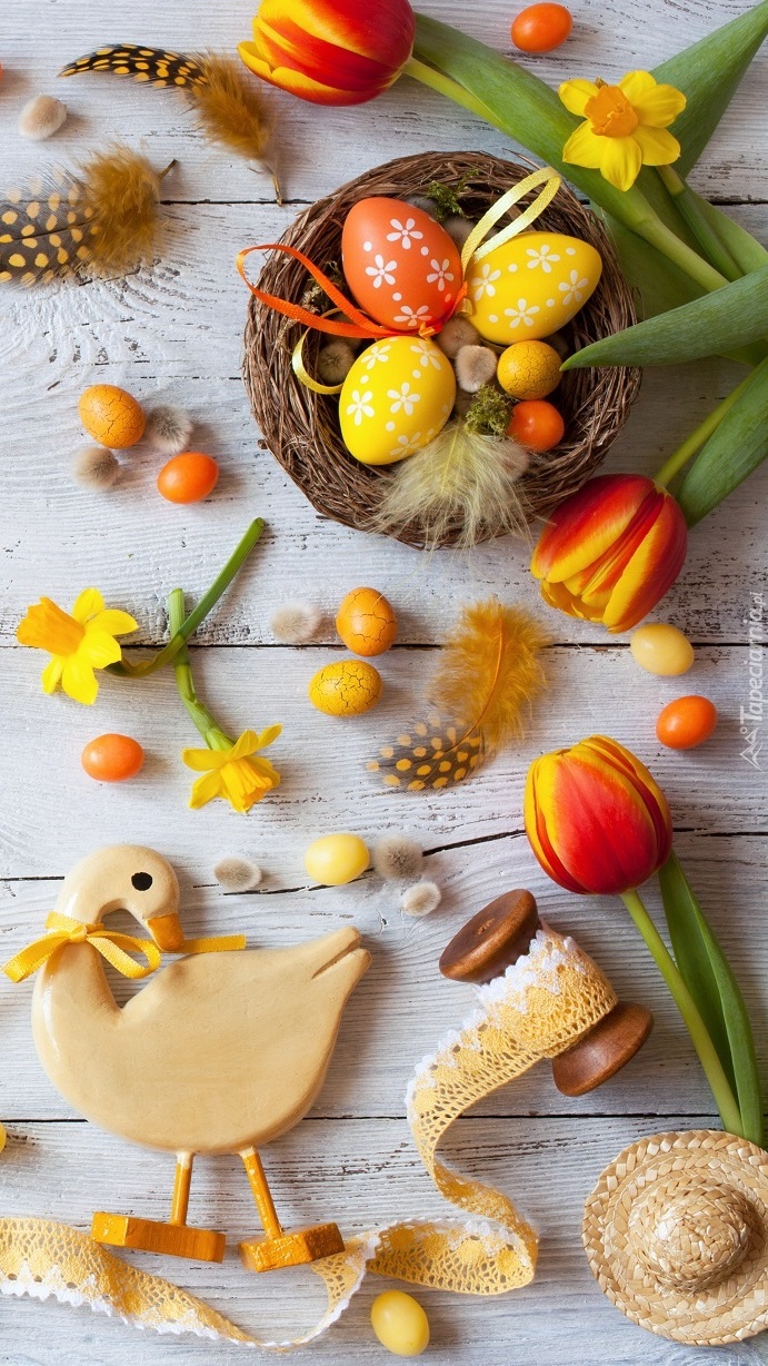 Edytor tapety: Drewniana gąska koło pisanek w koszyku