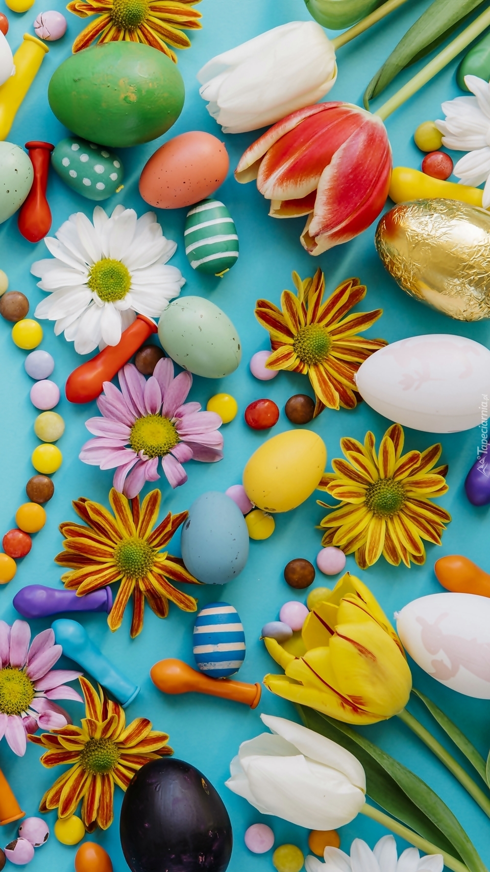 Edytor tapety: Pisanki z kwiatami i cukierkami