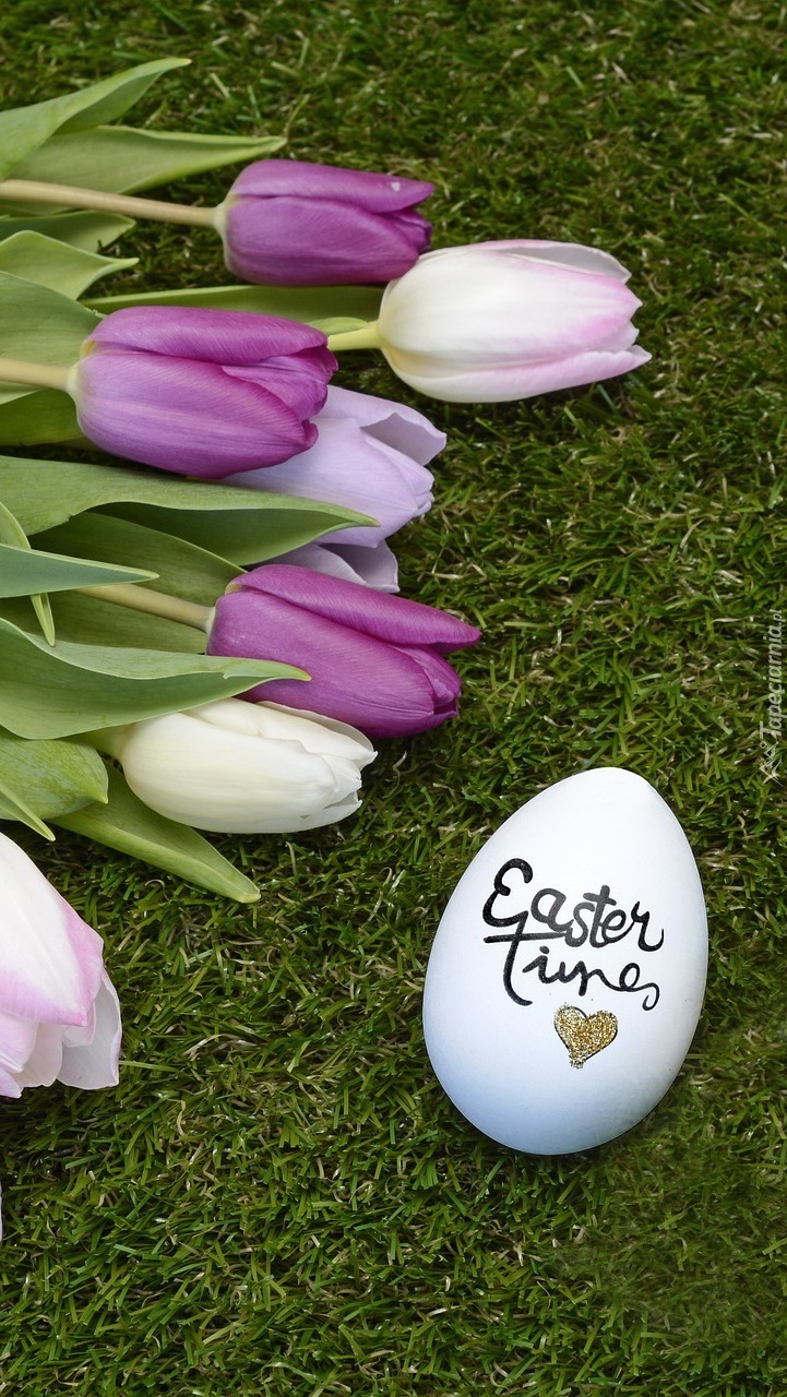 Edytor tapety: Tulipany z pisanką na trawie