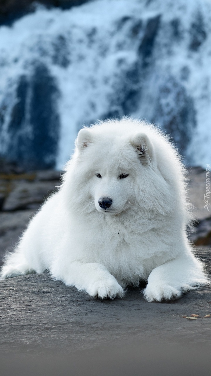 Edytor tapety: Samojed z wodospadem w tle