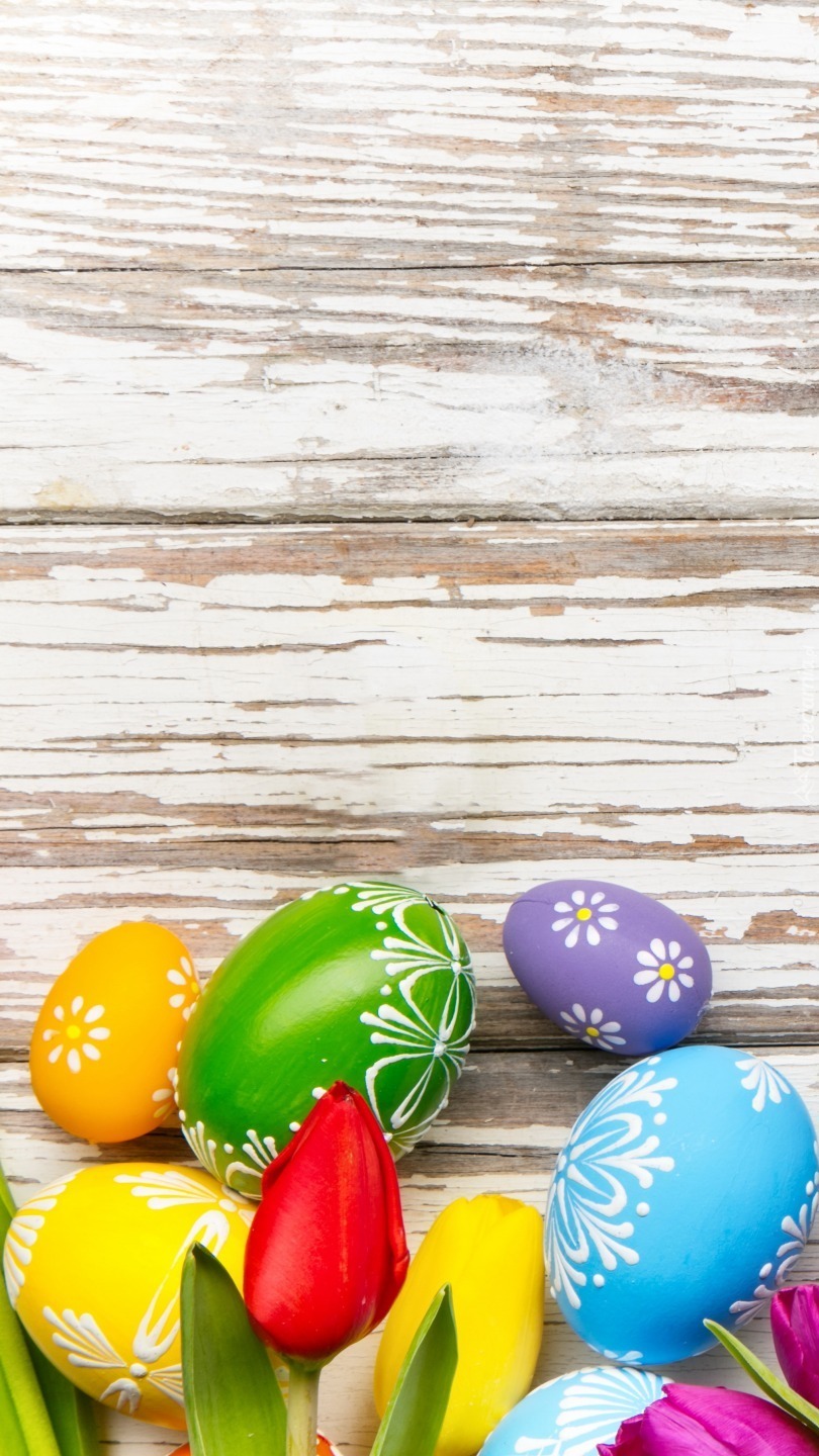Edytor tapety: Pisanki i tulipany na deskach