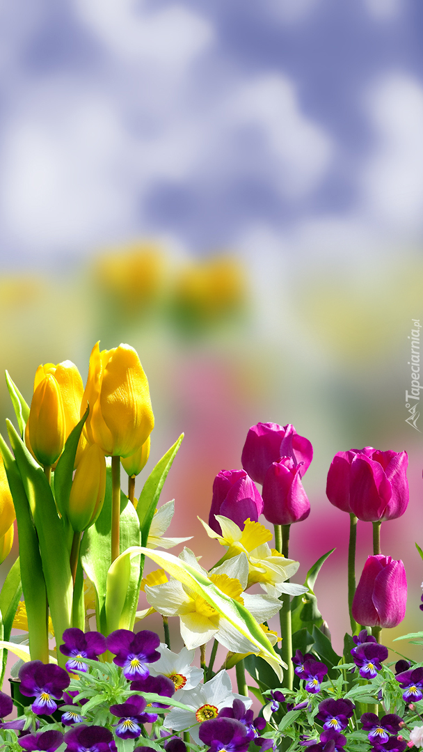 Edytor tapety: Bratki tulipany i żonkile