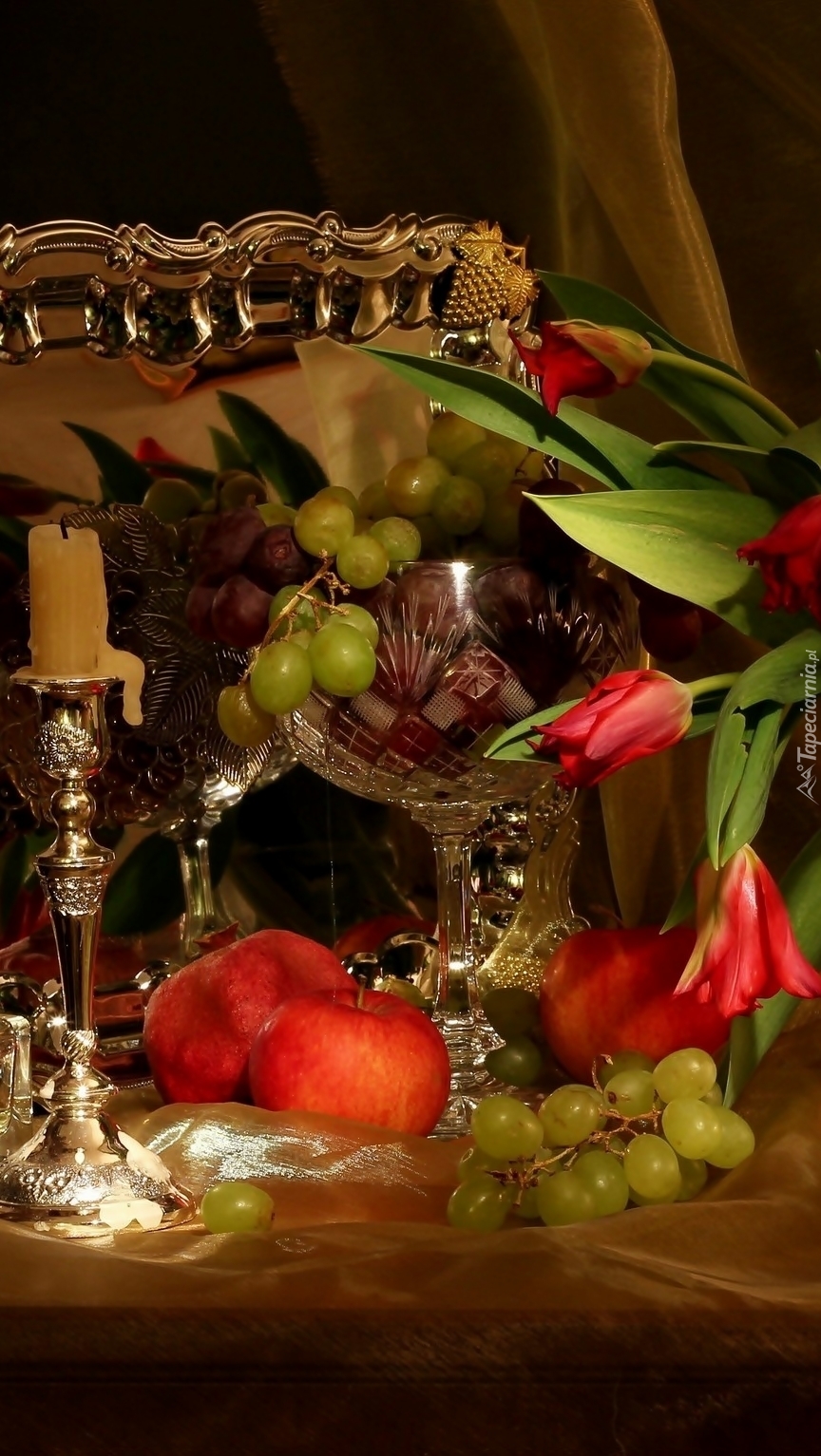 Edytor tapety: Winogrona koło świecy i tulipanów