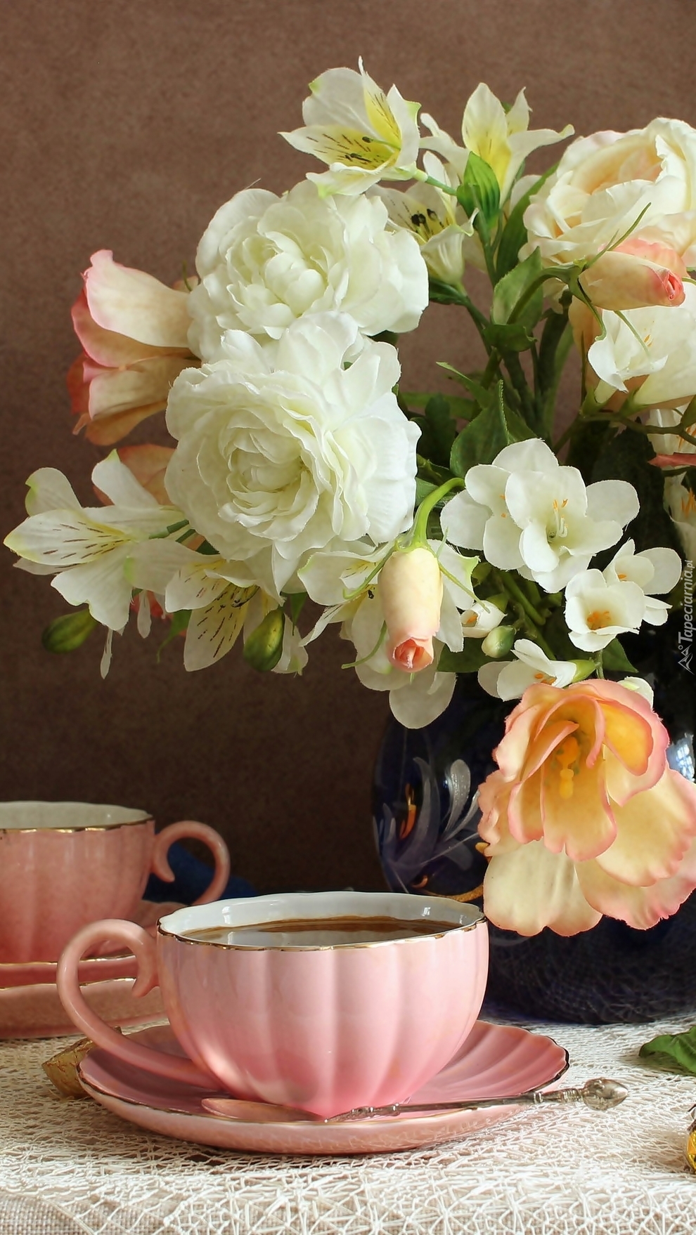 Edytor tapety: Filiżanki obok wazonu z kwiatami