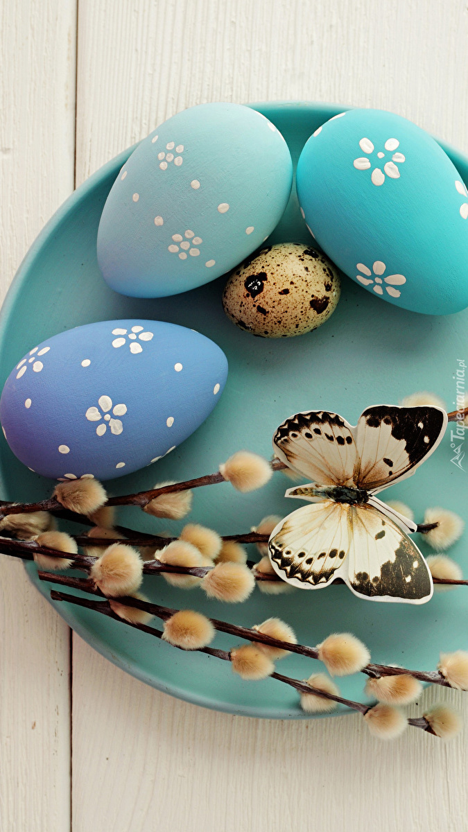 Edytor tapety: Motyl na baziach koło pisanek