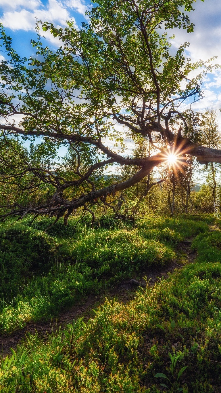 Edytor tapety: Ścieżka i drzewa przy promieniach słońca