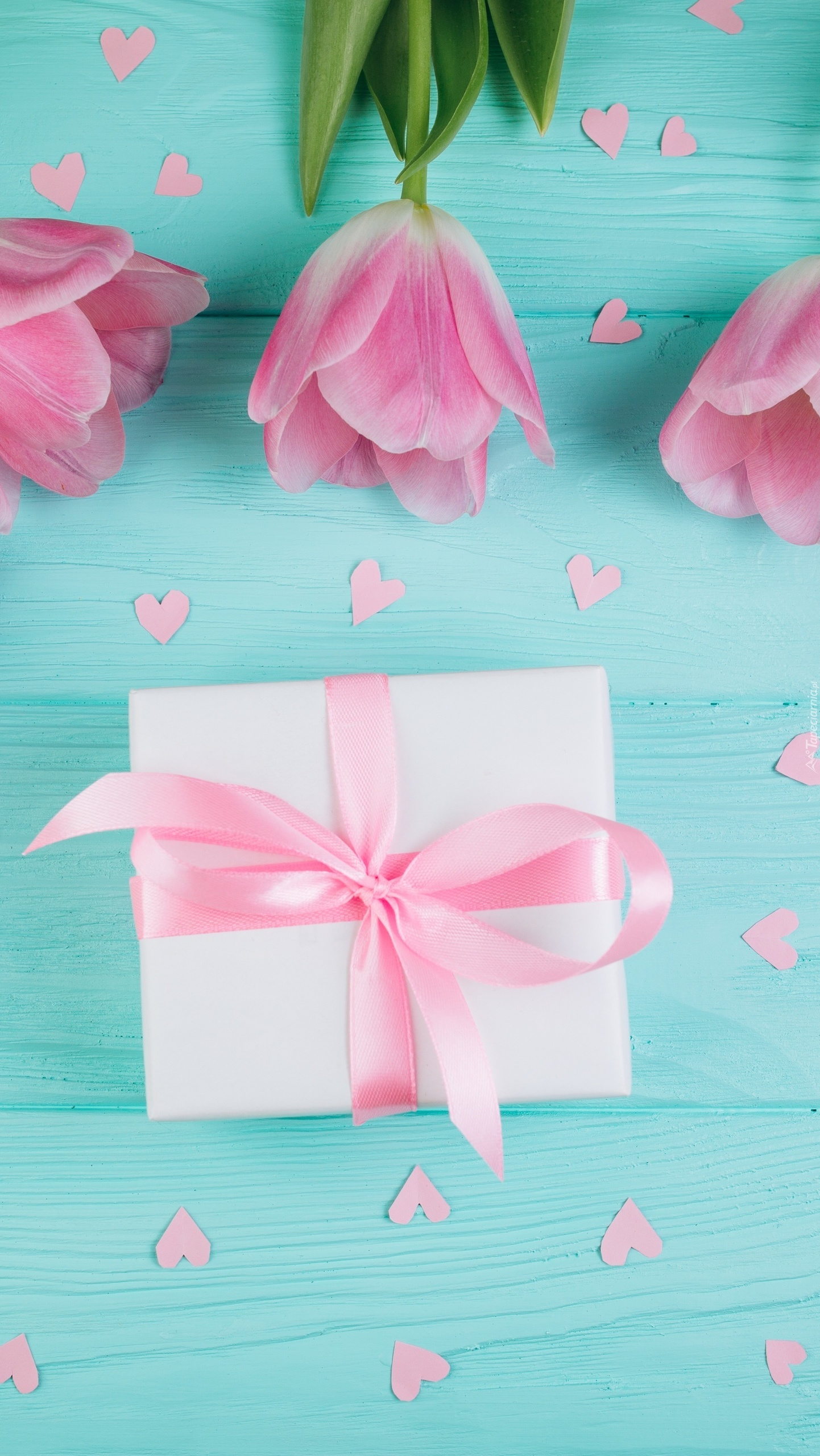 Edytor tapety: Różowe tulipany z prezentem