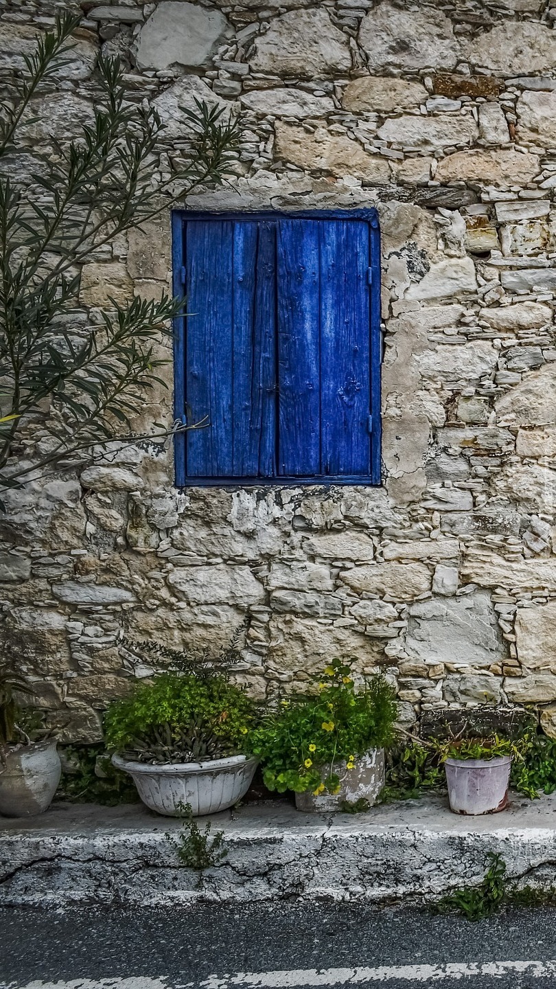 Edytor tapety: Niebieskie okiennice w kamiennej ścianie