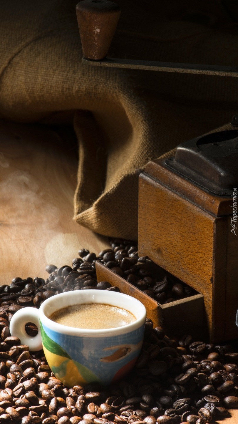 Edytor tapety: Filiżanka na ziarnach kawy obok młynka